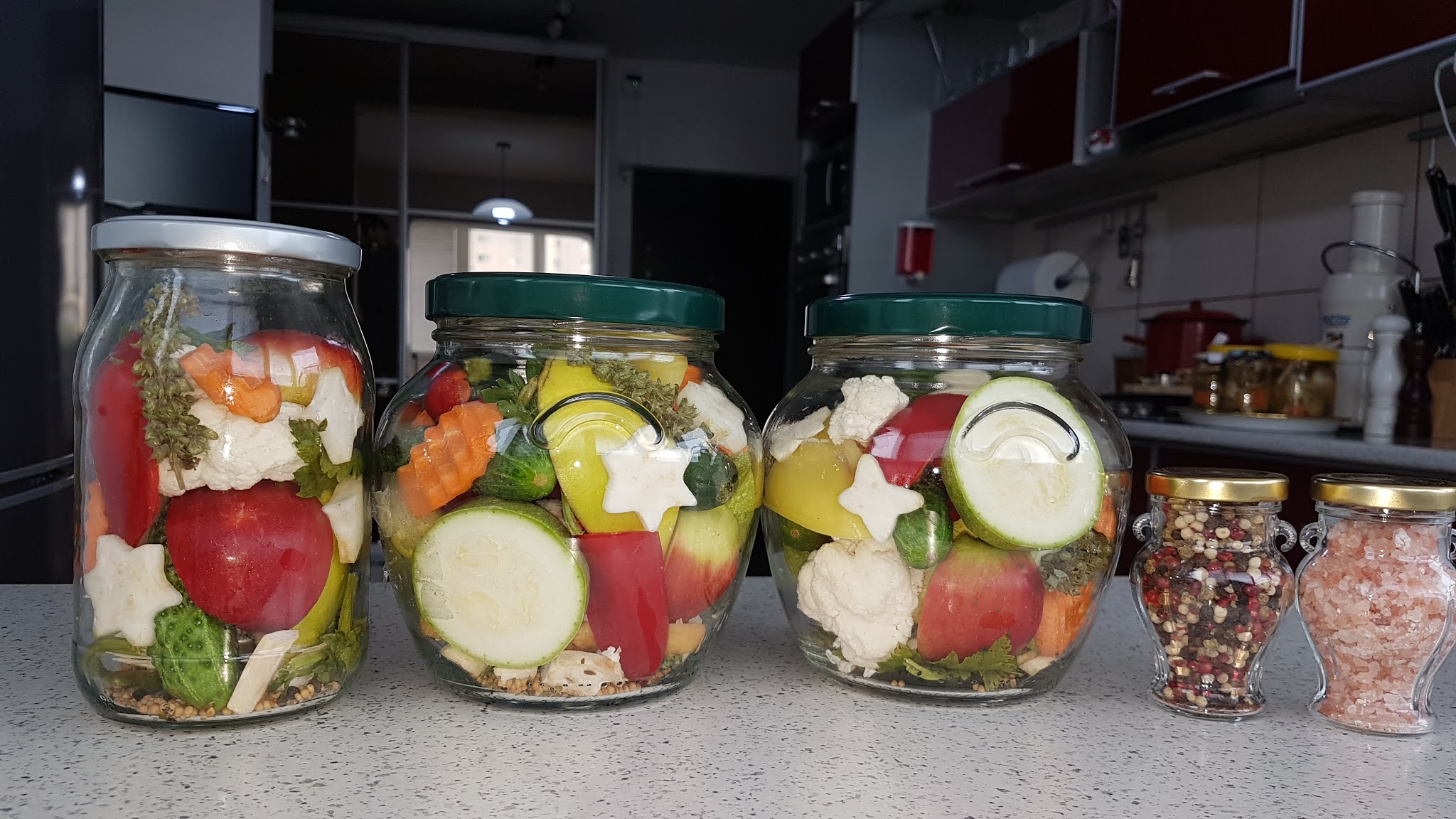 Varianta 3 super buna : Se pune 1 lg potrivita sare și 1 lg zahar la l de lichid, se fierbe cu mirodenii. N-am avut rabdare si am făcut-o cu apa fiarta cu sare si zahar fara mirodenii, turnata peste legume. Am tinut borcanul cu farfurioara peste in bucatarie vreo 7 zile apoi l-am pus jos pe balcon.