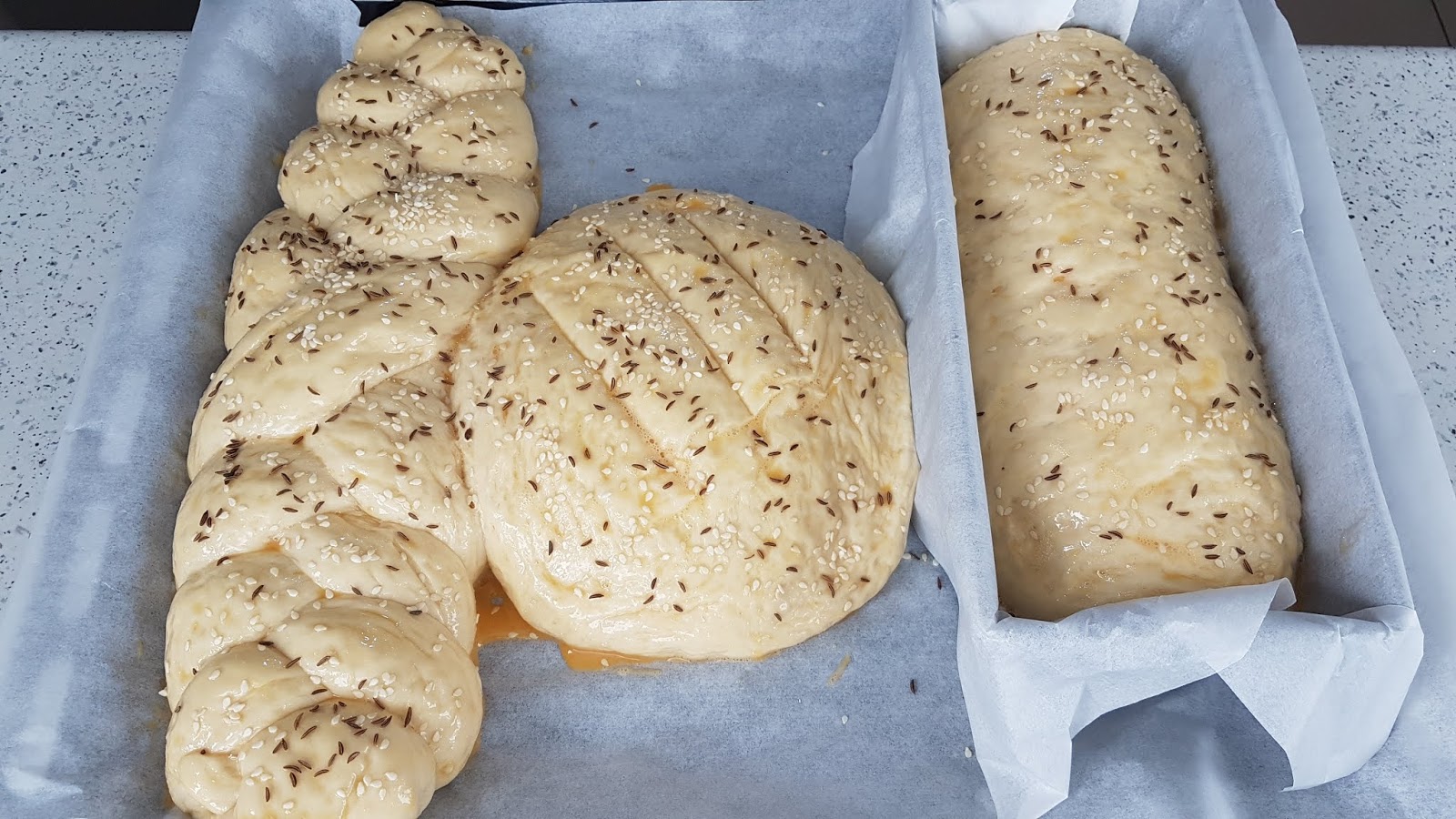 Faina se cerne si se face un gol in mijloc, se pune sarea. Pentru drojdia uscata se amesteca zaharul cu drojdia, 2 lg de faina si putina apa calda, se lasa 10-15 min sa faca basicute. Se toarna in gol, punem oul si laptele caldut treptat pana formam aluatul. Pentru drojdia proaspata fac maia in gol din zahar, drojdie si putin lapte cald si pun sarea pe margini. Vedem daca intra tot lichidul de 500 ml, eu l-am folosit pe tot dar mi-a ramas ceva faina in castron. Cand s-a format aluatul punem uleiul. Framantam bine din exterior in interior aducand aluatul si bagand la mijloc, aluatul nu se lipeste de mana si face basicute cand e gata. Lasam aluatul la dospit acoperit cu prosop pentru circa o ora. Formam painea, punem in forma pt cuptor tapetata cu hartie de copt si mai lasam 20 min la dospit. Eu am impartit aluatul in trei si am facut o paine rotunda, una dreptunghiulara si una inpletita in 3, impletitul se face de la mijloc ca sa ne fie mai usor. Pt cea dreptunghiulara formam un dreptunghi din aluat si rulam strans bine apoi intoarcem si strangem un pic in parti. Cea impletita o facem barcuta si atrangem un pic sa iasa spic de grau. In tava de aragaz tapetata cu hartie de copt punem toate 3 painile, cea dreptunghiulara in forma de cozonac cu hartie de copt si celelalte doua langa ea in tava de cuptor. La painea rotunda se face 3 crestaturi. Apoi ungem cu ou batut cu lapte sau apa din abundenta, eu am dat cu ou batut simplu, punem seminte de susan, mac sau chimen si punem la copt. Dam la cuptorul incalzit la temperatura de 180° la cuptorul electric, functia fara ventilatie pt 30-40 min. Dupa 30-35 min facem testul cu scobitoarea si daca nu e gata se mai lasa, eu am scos-o dupa 30 min. Cand e gata o scoatem si o ungem cu apa rece sa se inmoaie coaja. Putem pune o tava cu apa in cuptor, astfel se face la abur, eu am facut fara. Daca facem la robot sau la masina de paine : amestecam faina cu drojdia uscata si le punem la robot, punem zaharul, oul, laptele si sarea, lasam sa se framante. La sfarsit punem uleiul treptat. Vreo 10 min la robot e suficient. Daca facem cu drojdie proaspata facem mai intai maia din drojdia pisata, zaharul putina faina si putin lapte cald, lasam la dospit apoi punem in robot peste faina. Din acest aluat putem face si gogosi, placinte, turte, pizza, chifle, cornuri.